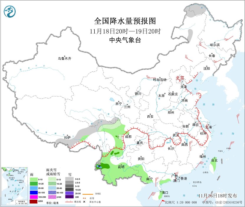 图6 全国降水量预报图(11月18日20时-19日20时)