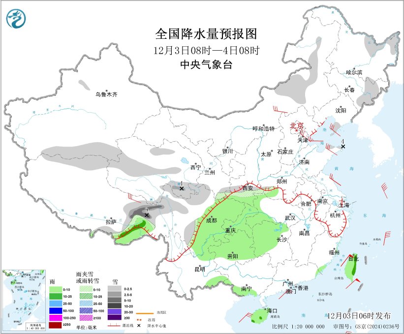 图1 全国降水量预报图(12月3日20时-4日20时)