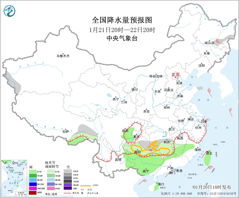 中央气象台1月20日18时继续发布冰冻黄色预警:预计,1月20日20时至21日20时,贵州中东部和西北部、湖南中南部、广西北部、广东西北部、云南东北部、江西中部、福建西北部等地的部分地区有冻雨或冰粒,上述大部地区冻雨量1~2毫米,其中湖南西南部、贵州东南部、广西北部部分地区3~5毫米、局地可达6毫米以上(见图1)。