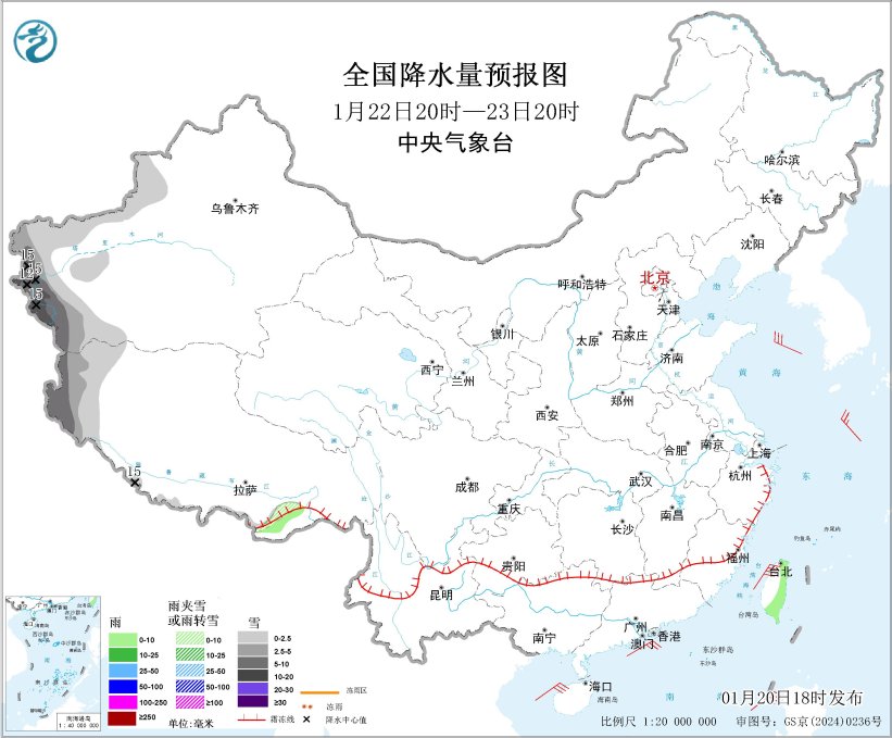 图5 全国降水量预报图(1月22日20时-23日20时)