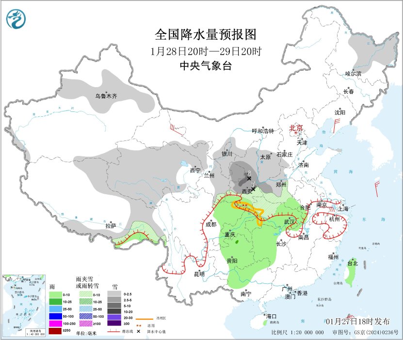 图1 全国降水量预报图(1月27日20时-28日20时)