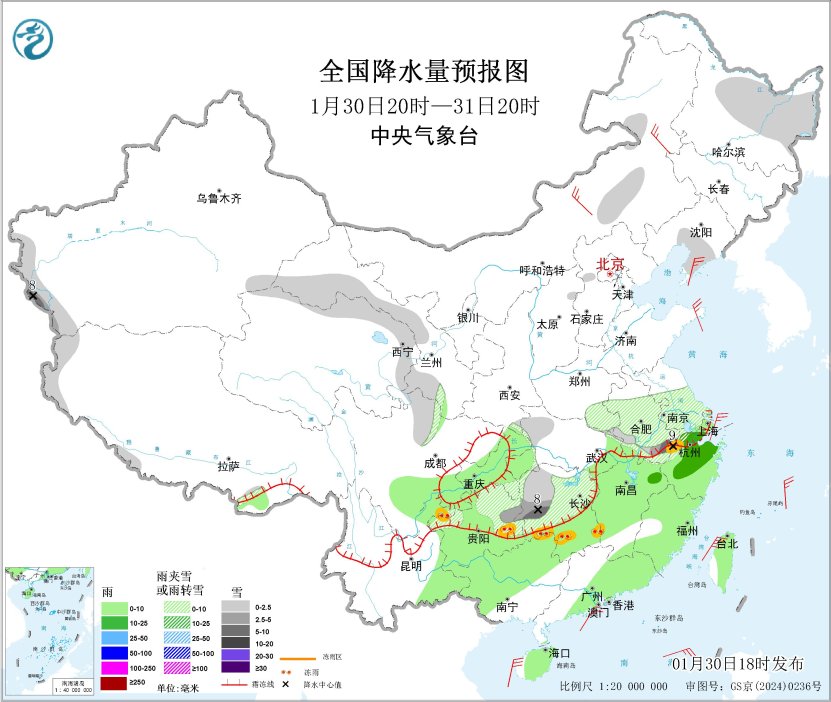 受冷暖空气共同影响,30日夜间至31日,江汉西部、江淮、江南东北部和西北部及贵州东北部等地有小到中雪或雨夹雪,安徽南部和湖南西部等地局地有大雪,高海拔山区局地有冻雨;西南地区东部、江南、华南等地有小到中雨。