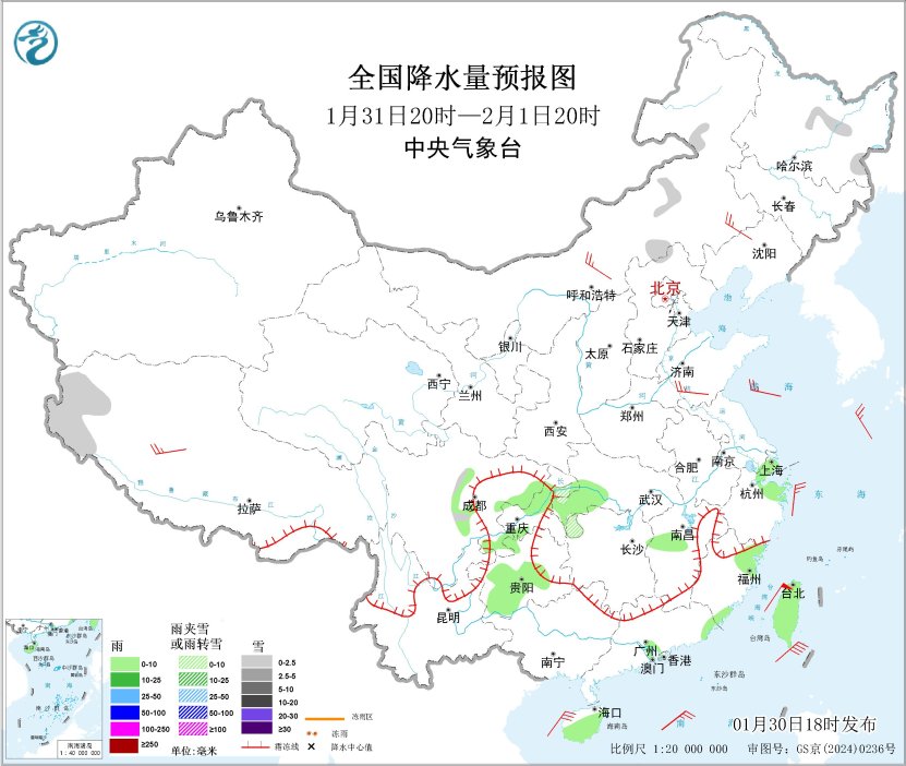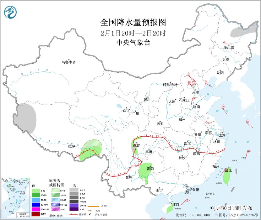 图1 全国降水量预报图(1月30日20时-31日20时)
