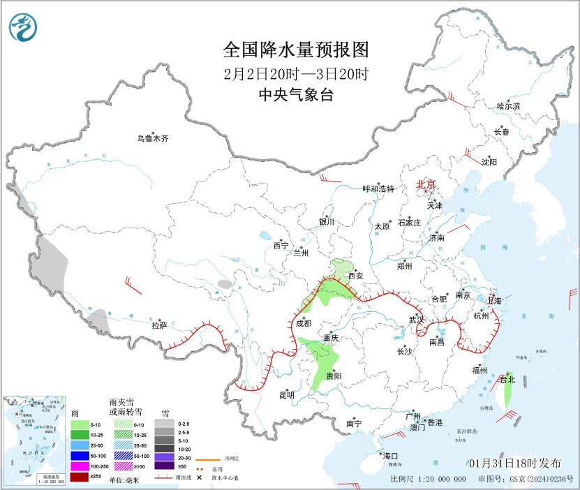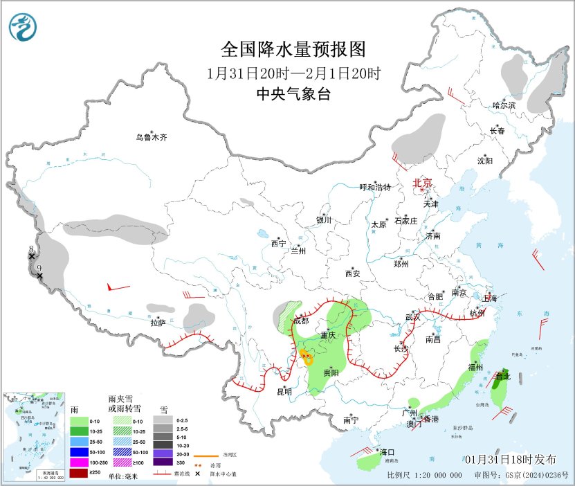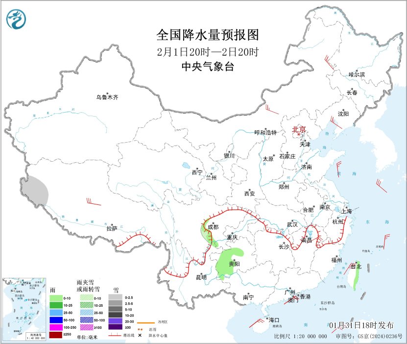 图2 全国降水量预报图(1月31日20时-2月1日20时)