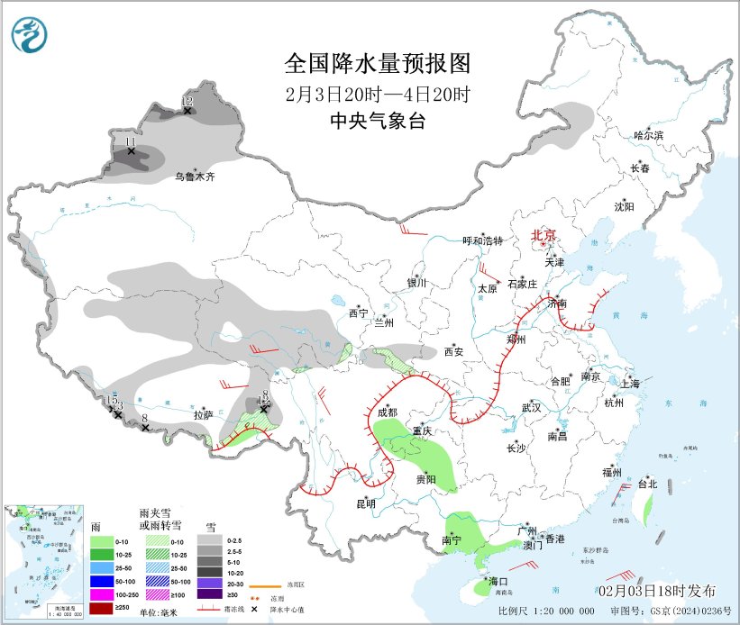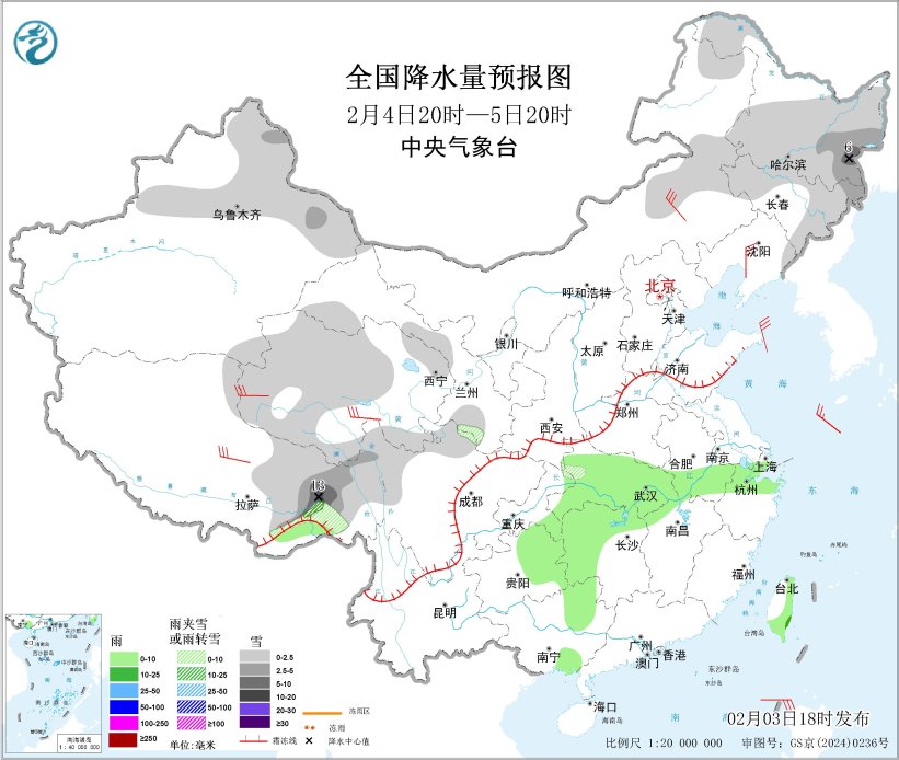 图2 全国降水量预报图(2月3日20时-4日20时)