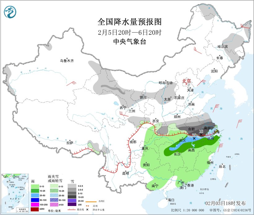 5至6日,江汉、江南、西南地区东部及华南大部等地有小到中雨、局地大雨,河南中南部、江苏、安徽、上海、浙江中北部、湖北北部等地还将出现雨转雪或雨夹雪,河南南部、安徽中南部、江苏中南部、浙江北部等地的局部地区有大到暴雪;西北地区东部、华北西部、东北地区等地有小到中雪。