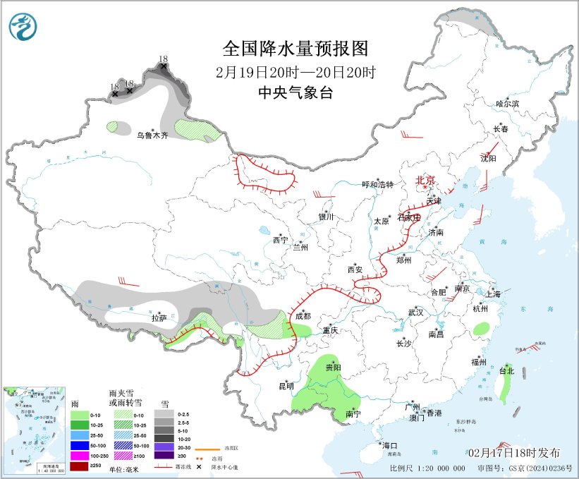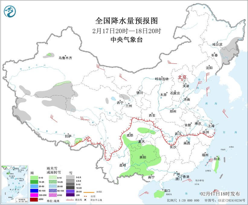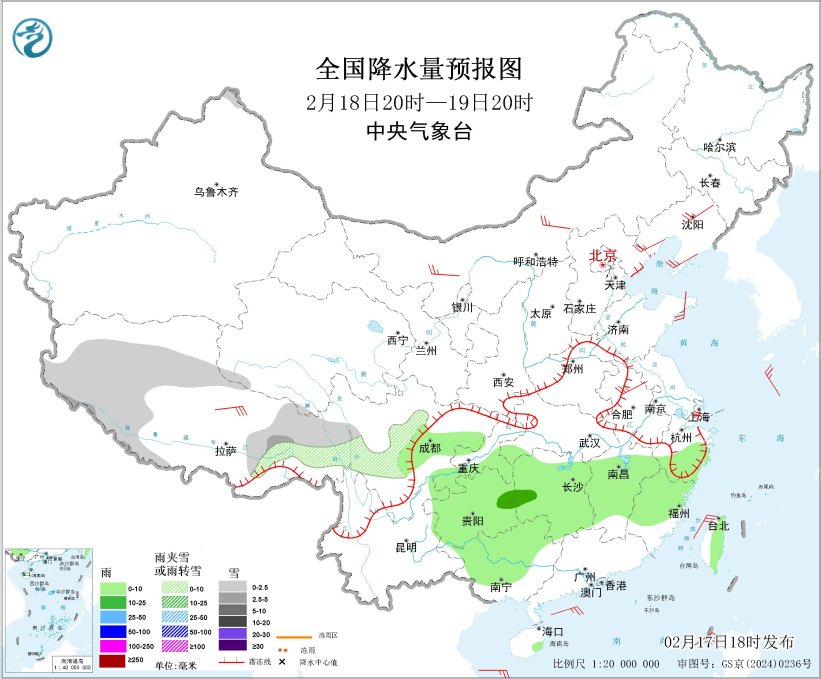 图1 全国降水量预报图(2月17日20时-18日20时)