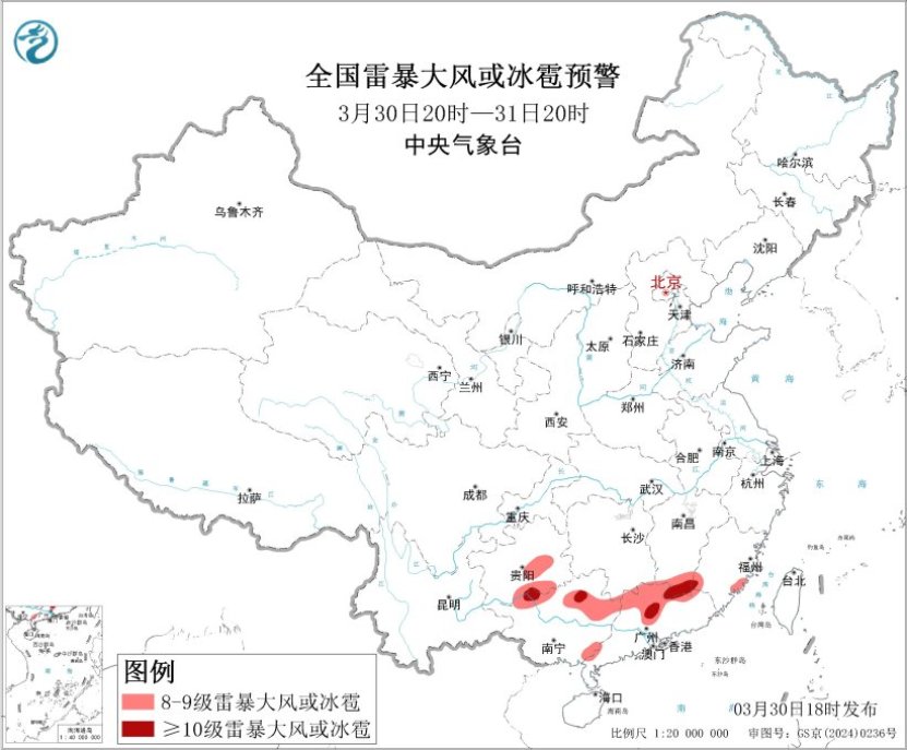 30日夜间至31日,西南地区东部、江南、华南等地有较强降雨。预计,3月30日20时至31日20时,广西北部和东部、广东中北部、湖南南部、江西南部和东部、福建西部和北部、浙江中南部以及重庆南部、贵州东部等地部分地区有大到暴雨(50~70毫米)(见图1)。上述部分地区伴有短时强降水(最大小时降雨量20~50毫米,局地可超过60毫米),局地有雷暴大风、冰雹等强对流天气(见图2)。中央气象台3月30日18时继续发布暴雨蓝色预警和继续发布强对流天气黄色预警。