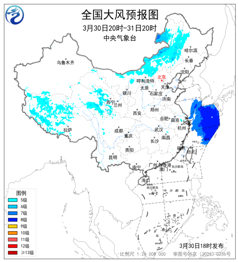 另外,预计,3月30日20时至31日20时,西藏西部和北部、青海东部、内蒙古中东部、黑龙江西部等地部分地区有5~6级风、阵风7~8级;黄海东南部海域、东海东部海域将有7~8级、阵风9级的大风(见图4)。中央气象台3月30日18时继续发布大风蓝色预警。