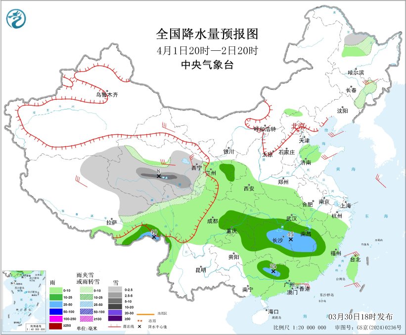 图1 全国强降雨落区预报图(3月30日20时-31日20时)