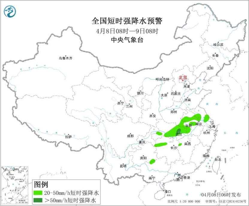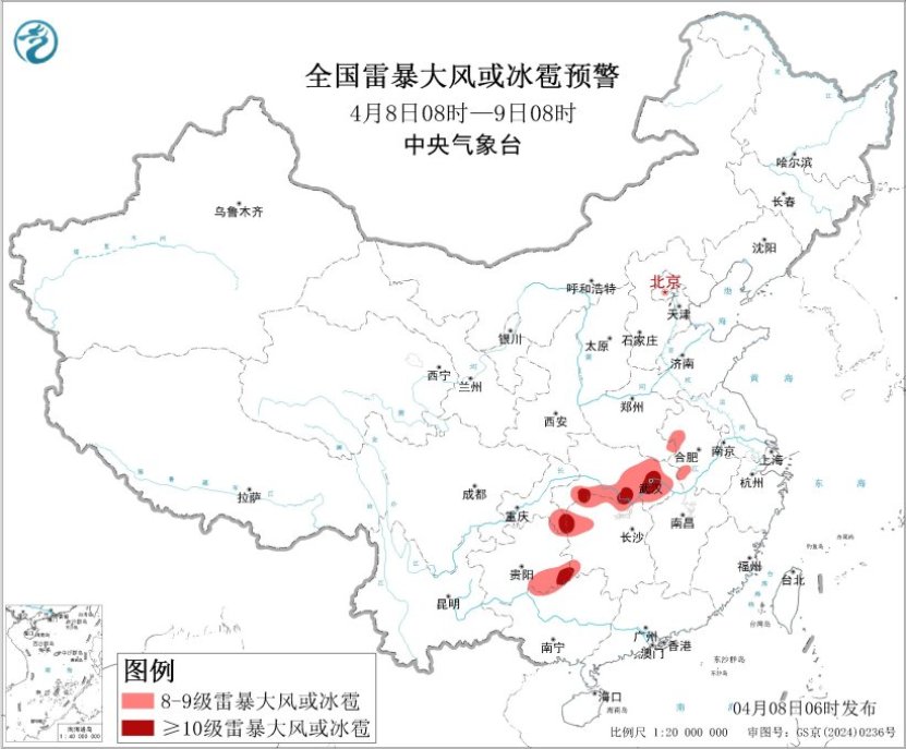 中央气象台4月8日06时发布暴雨蓝色预警、继续发布强对流天气蓝色预警。预计,4月8日08时至9日08时,湖北南部和东部、安徽中北部、河南南部、江苏中北部等地部分地区有大到暴雨,其中,湖北东部局地有大暴雨(100~150毫米)。上述部分地区伴有短时强降水(最大小时降雨量20~40毫米,局地可超过50毫米),局地有雷暴大风或冰雹等强对流天气(见图1)。江汉、江淮西部、江南北部、西南地区东部等地的部分地区将有8级以上雷暴大风或冰雹天气,其中,湖北东部和南部、湖南西部、重庆东南部、贵州东南部等地的部分地区将有10级以上雷暴大风,最大风力可达11级以上(见图2);湖北东部和南部、安徽中北部、江苏中部、河南南部、湖南北部等地的部分地区将有小时雨量大于20毫米的短时强降水天气,其中,湖北东部局地小时雨量大于50毫米(见图3)。