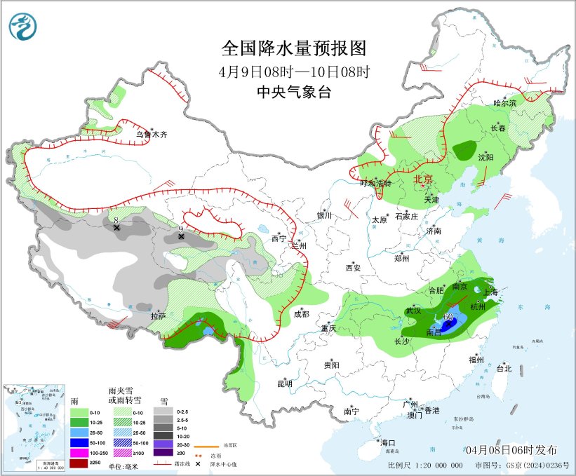 图5 全国降水量预报图(4月8日08时-9日08时)