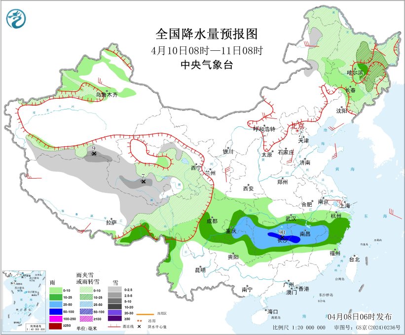 4月10日08时至11日08时,新疆北疆高海拔山区和南疆盆地、西藏北部和东部、青海大部、川西高原北部、内蒙古东北部、黑龙江、吉林东部、辽宁东北部等地部分地区有小到中雪或雨夹雪,其中,新疆南疆盆地、青海南部等地局地有大雪(5~9毫米);西藏东南部、云南西北部、四川盆地、重庆大部、贵州北部、江南大部等地部分地区有中到大雨,其中,湖南中部、江西西部等地部分地区有暴雨(50~90毫米)。内蒙古中东部、黑龙江东北部、辽东半岛、山东半岛、河北南部、新疆沿天山地区、西藏南部和西部、西北地区东部、苏皖南部等地部分地区有4~6级风;东海大部海域、台湾海峡、台湾以东洋面、北部湾、南海西北部海域有5~6级风,阵风7级(见图7)。