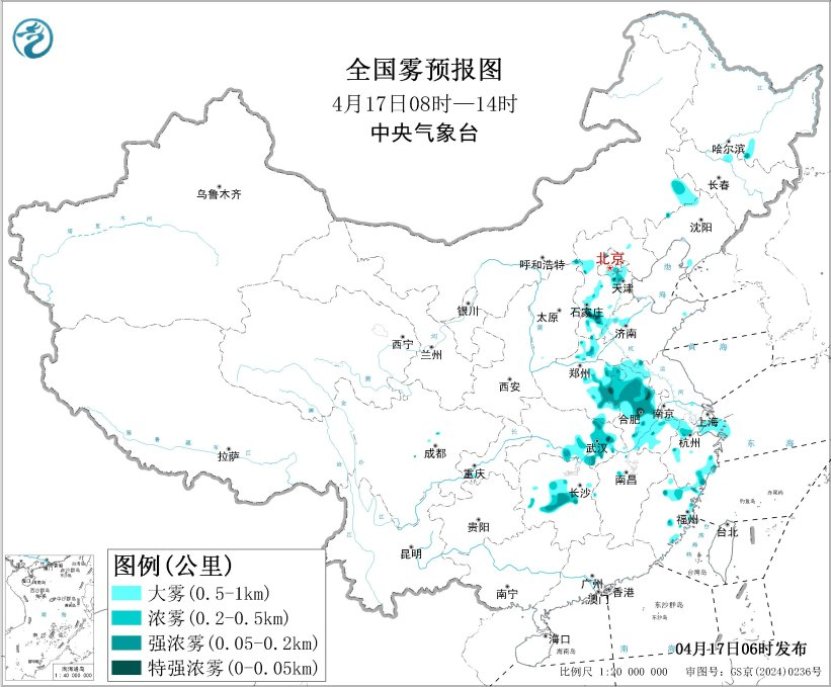 今晨,北京南部、天津西部、河北中南部、山东北部和西部、河南北部和东部、湖北中东部、安徽、江苏西部、浙江、福建东部和北部、江西北部、湖南中北部、广西北部等地出现能见度不足1公里的大雾天气,局地能见度不足200米。