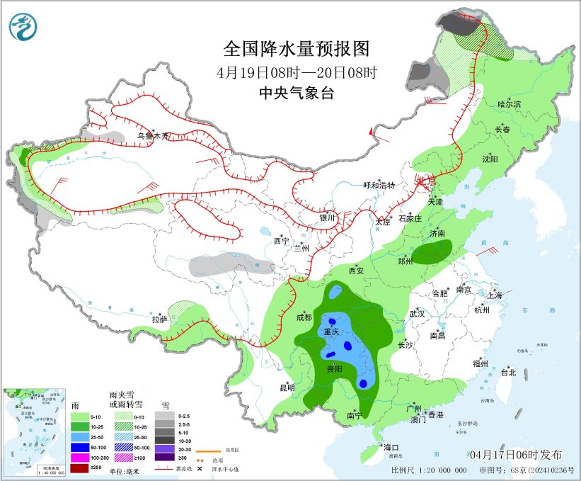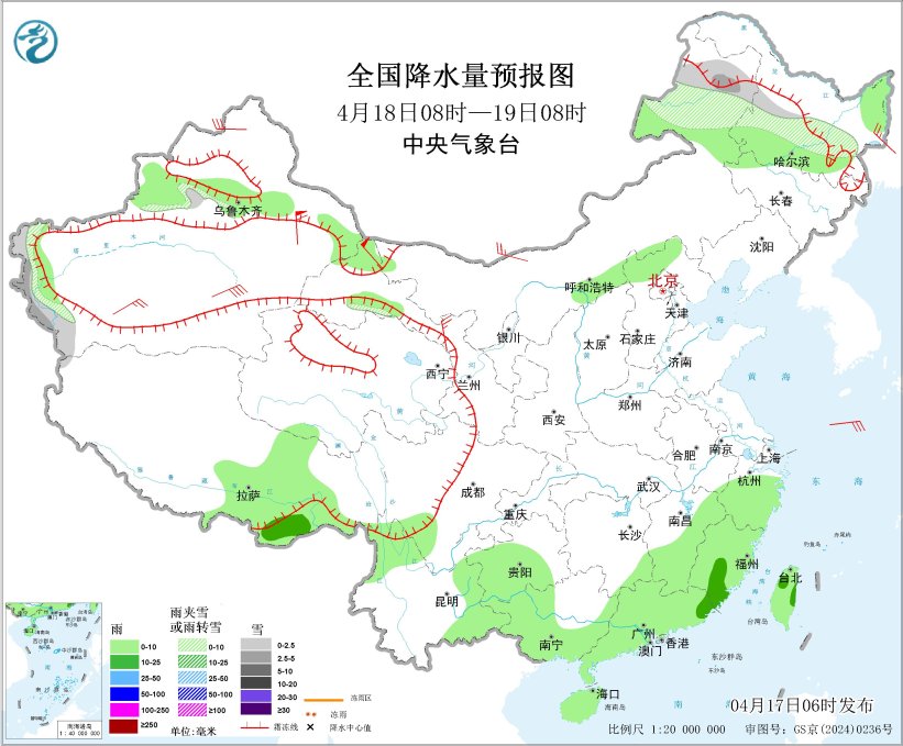 图4 全国降水量预报图(4月17日08时-18日08时)