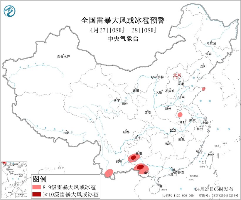 图2 全国雷暴大风或冰雹预警(4月27日08时-28日08时)