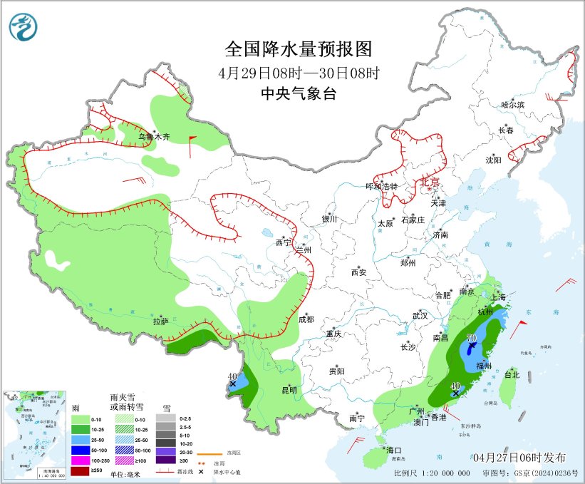 图4 全国降水量预报图(4月27日08时-28日08时)
