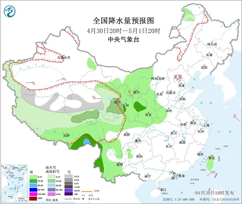 4月30日08时至5月1日08时,内蒙古东北部、黑龙江西北部、西藏北部和西部、青海南部和西部等地部分地区有小雪或雨夹雪。西藏东南部、青海东部、云南西部等地部分地区有中到大雨,其中,西藏东南部等地部分地区有暴雨。新疆南疆盆地、青海北部、甘肃河西等地部分地区有4~6级风,其中,新疆东部部分地区有6~7级风(见图5)。