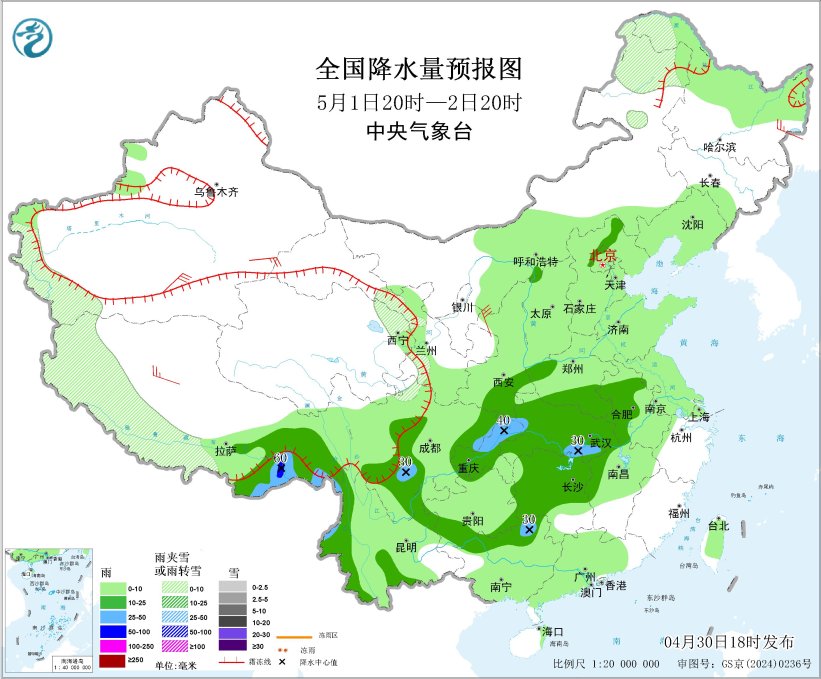 图5 全国降水量预报图(4月30日08时-5月1日08时)