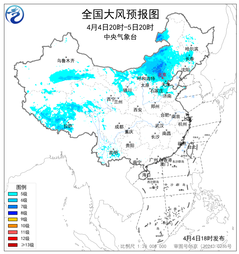 中央气象台4月4日18时继续发布大风蓝色预警和沙尘暴蓝色预警。4月4日20时至5日20时,内蒙古大部、山西北部、京津冀北部和南部、山东北部、新疆南部、青海南部、西藏中西部、川西高原北部等地部分地区有5~7级风,阵风7~9级;其中,内蒙古中部局地阵风10级以上(见图1)。受冷空气大风影响,新疆南部、内蒙古中西部、山西北部、河北中北部、北京中北部等地的部分地区有扬沙或浮尘天气(见图2)。