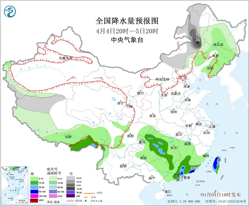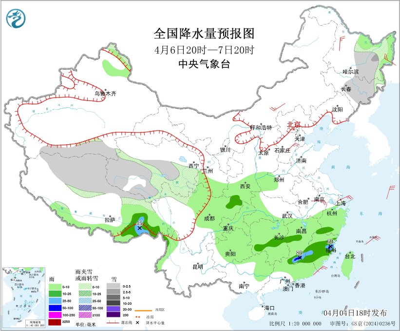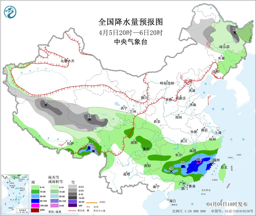 4月5日20时至6日20时,内蒙古东北部、黑龙江大部、吉林西部、青海南部、川西高原北部、西藏北部等地部分地区有小到中雪或雨夹雪,局地有大到暴雪(10~12毫米)。重庆中部、贵州东部、四川中部、湖南南部、江西中南部、浙江南部、广西北部、广东北部、福建大部、西藏东南部等地部分地区有中到大雨,其中,湖南东南部、江西南部、福建中部、广东北部等地部分地区有暴雨到大暴雨(50~105毫米)。内蒙古中东部、东北地区大部、华北北部、山东半岛、西藏南部等地部分地区有4~6级风;东海东部海域将有6~8级风、阵风9级(见图4)。