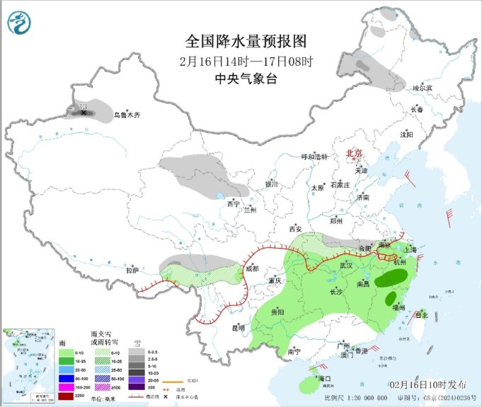 16日14时至17日08时,内蒙古东部、新疆伊犁河谷、西藏东部、青海北部、甘肃西部、陕西南部、河南南部、安徽中部、湖北西部和北部、川西高原中部等地部分地区有小雪或雨夹雪,新疆伊犁河谷局地有中到大雪,局地暴雪。江汉东部、江南、西南地区东部、华南西部等地有小雨,江西东北部、浙江南部、福建北部等地部分地区有中雨。(见图2)。