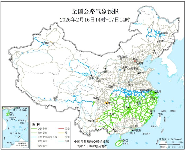 图4 全国公路气象预报图(2月16日14时至17日14时)