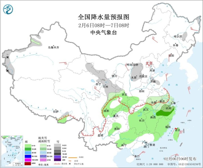 预计今天,江汉、江淮、江南、西南地区东部及华南等地有小到中雨;安徽南部、江苏南部、浙江北部、上海等地将有雨转雪或雨夹雪天气,其中安徽南部、浙江北部局地有大雪或暴雪。
