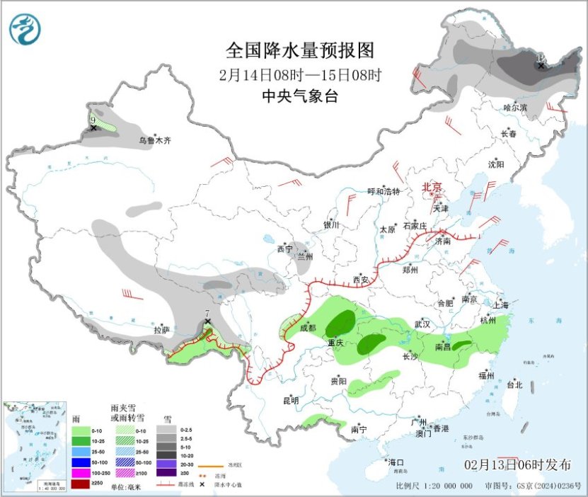 另外,在降水方面,未来三天,西南地区东部、江南、华南西部和北部等地有小到中雨;15日,长江中下游一带降雨范围增大、强度增强,湖南、江西、湖北等局地有大雨或暴雨;内蒙古东北部、黑龙江及西藏东部、川西高原等地部分地区有小雪或雨夹雪,部分地区有中到大雪。