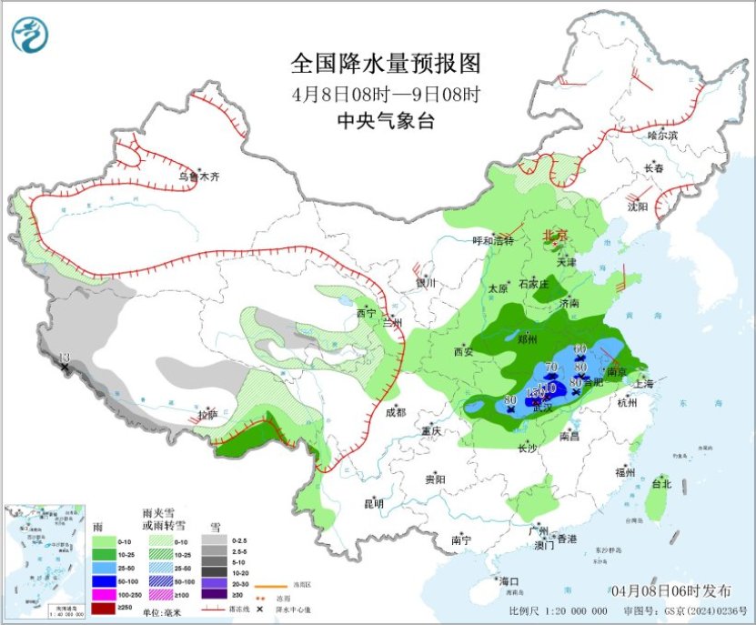 预计4月8-10日,江汉、江淮、江南北部及重庆等地的部分地区有中到大雨,局地暴雨或大暴雨,并伴有短时强降水、雷暴大风或冰雹等强对流天气。中央气象台今晨同时发布了暴雨蓝色预警和强对流天气蓝色预警。