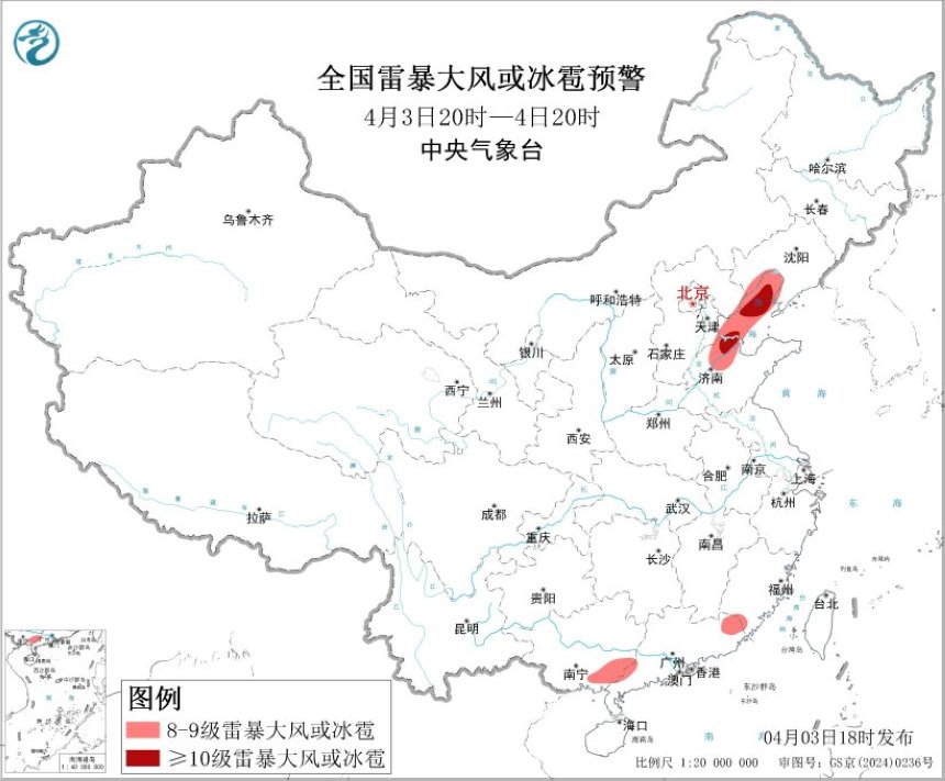 中央气象台4月3日18时继续发布强对流天气蓝色预警