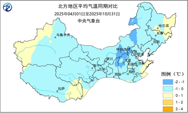 图2 2025年4-10月北方地区气温与常年(上)和2024年(下)同期对比