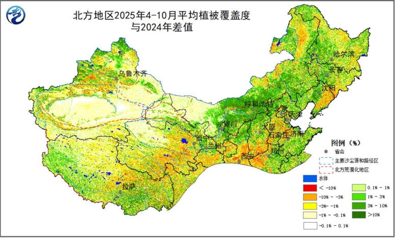 图3 2025年4-10月北方地区植被覆盖度与2024年同期对比