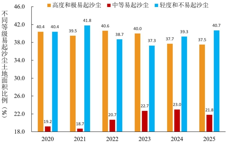 图4 2020-2025年北方地区不同等级易起沙尘土地面积比例