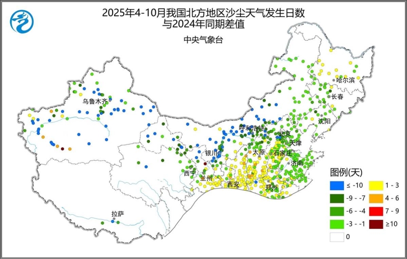 图5 2025年4-10月北方地区沙尘天气发生日数与2024年同期对比