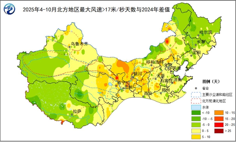 图6 2025年4-10月北方地区最大风速≥17m/s的天数与2024年同期对比