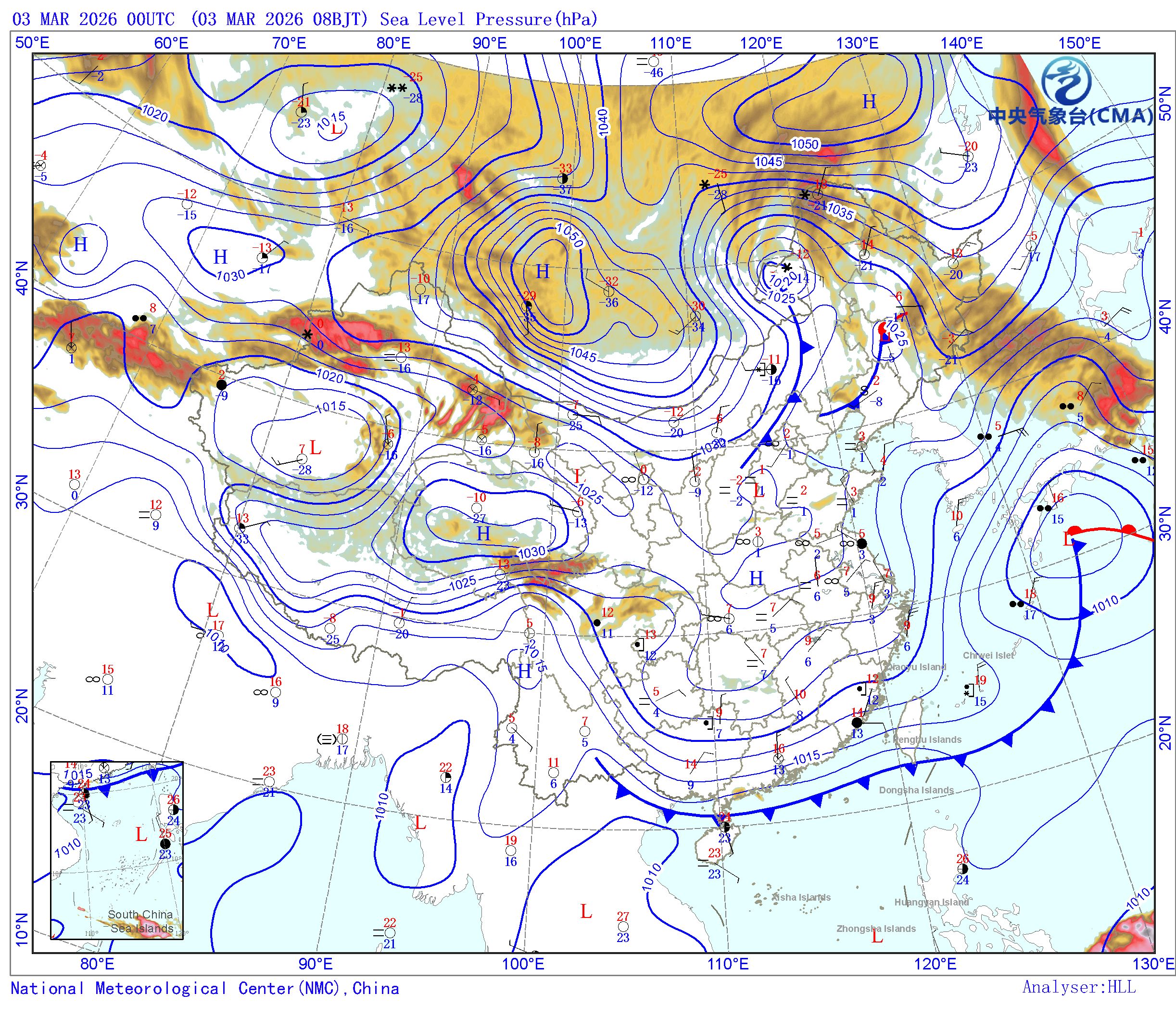 站点的填图要素包括:云量、风向风速、天气现象、温度(红色数字)和露点(蓝色数字);天气系统符号包括:高压中心(H)、低压中心(L)、冷锋(带三角形蓝色线段)、暖锋(带半圆形红色线段)和台风符号;蓝色等值线为海平面气压场等压线(单位hPa);底层填色为地形高度;顶层填色为红外卫星云图。